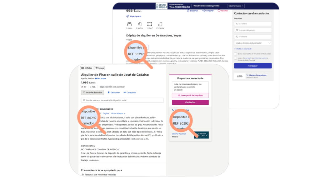 En la imagen de abajo puedes ver donde está el número de referencia del piso. Es el mismo número de referencia en Idealista y Fotocasa.